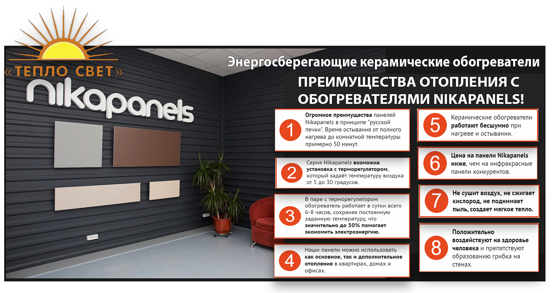 Пн. – Пт.: с 9:00 до 17:00 teplomax39@mail.ru +7 (900) 351-52-07 (Бухгалтерия) Одним из самых современных достижений техники в области отопительных систем являются энергосберегающие инфра-красно- конвективные керамические обогреватели nikapanels.